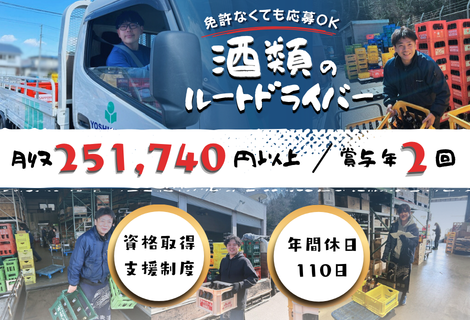 2t車にて酒類・飲料のルート配送ドライバー!働きやすい日勤帯!免許なしでも応募可能です!